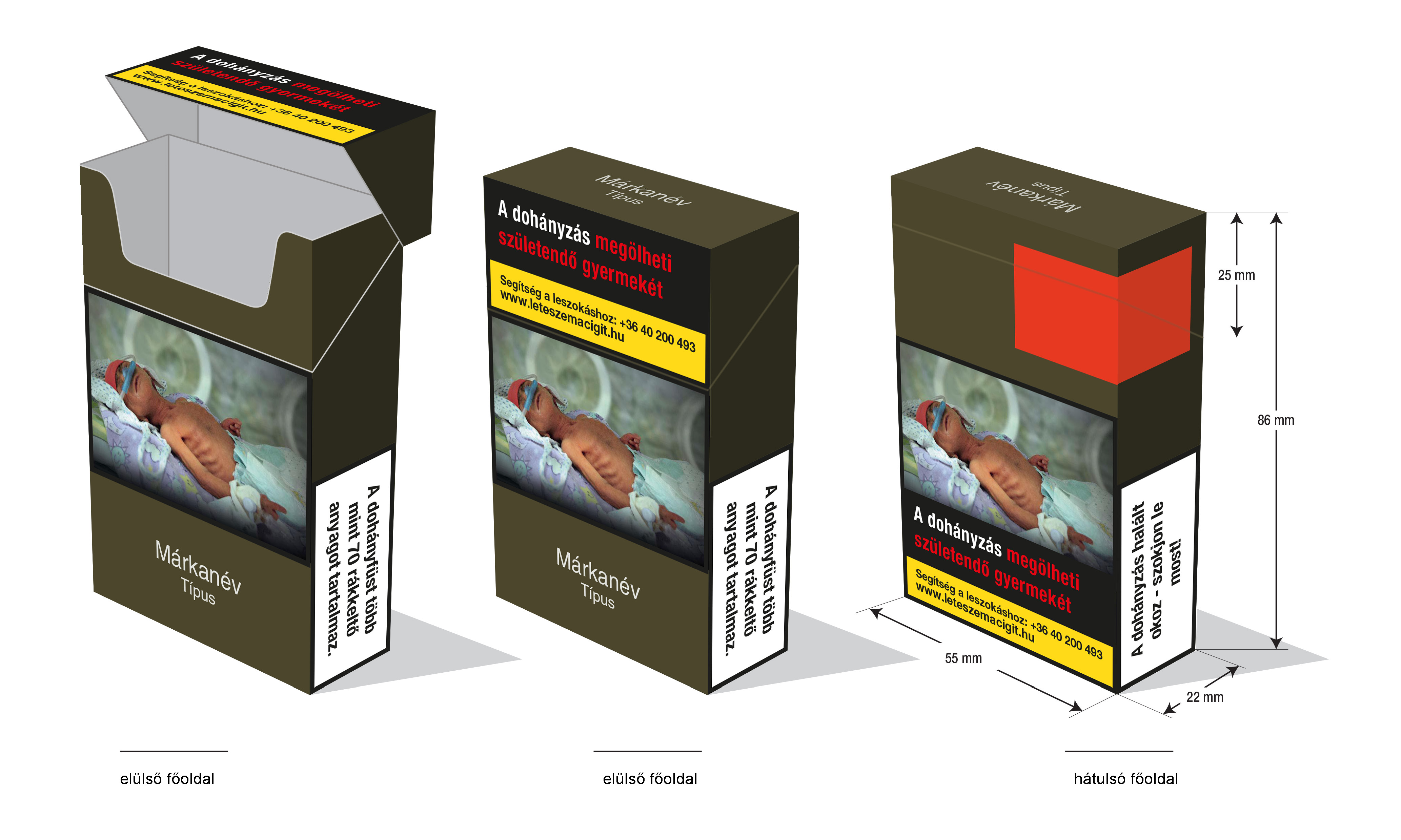 Mindezt figyelembe véve Magyarországon a cigaretta és a cigarettadohány tekintetében bevezetésre kerül az egységes csomagolás. Az egységes csomagolás cigarettára vonatkozó tervét a következő képek mutatják be.